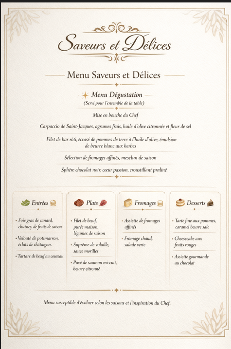 Découvrez notre menu, une véritable ode à la gastronomie où chaque plat est imaginé comme une expérience unique. Chez Saveurs et Délices, nous sublimons des produits frais et de saison à travers une cuisine raffinée, créative et pleine d’émotion. De l’entrée au dessert, laissez-vous séduire par des saveurs délicates, des associations harmonieuses et un savoir-faire authentique, pour un moment de plaisir et de partage inoubliable.