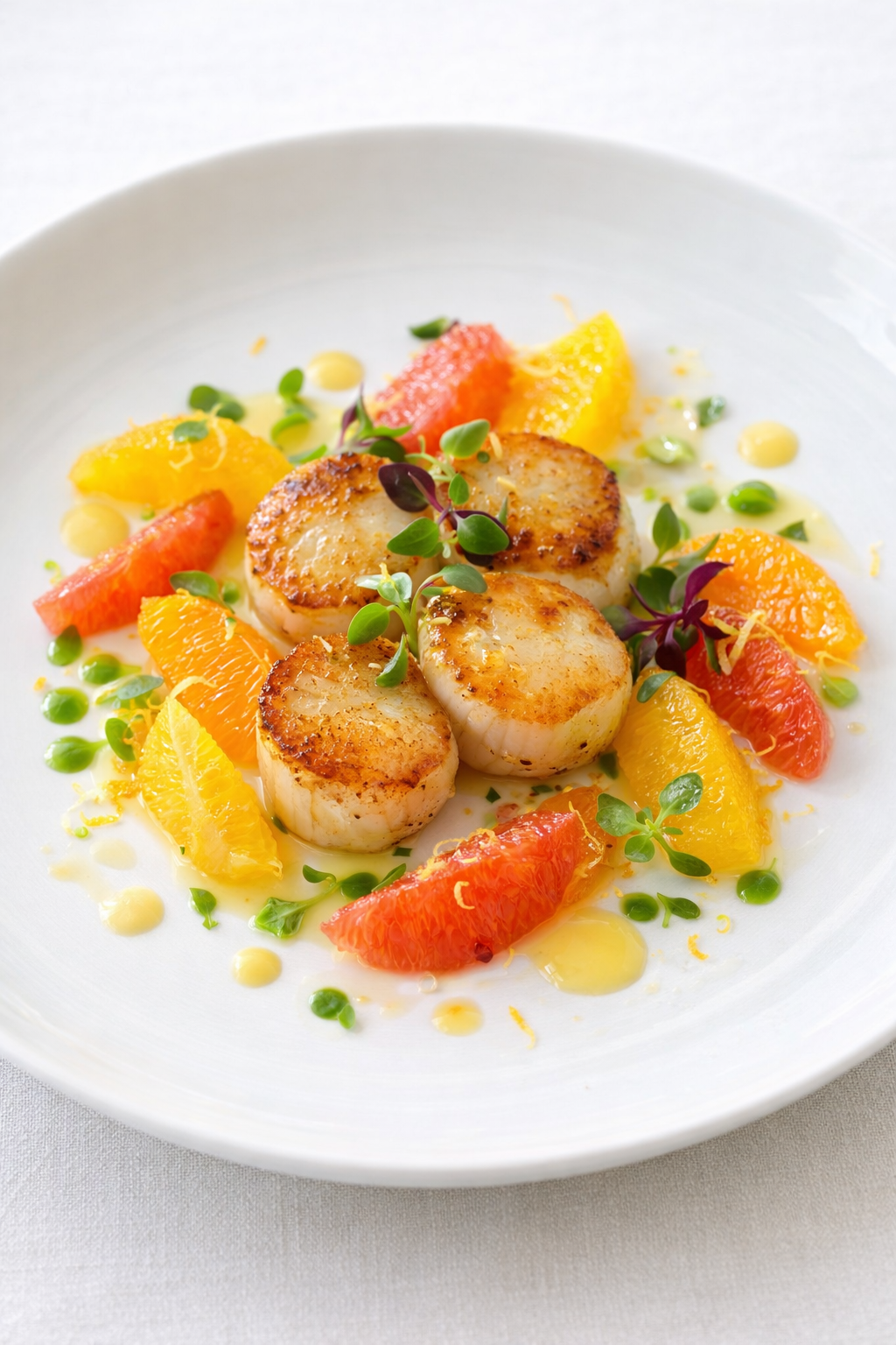 Cette recette incarne toute la philosophie de Saveurs et Délices : une cuisine d’émotion, guidée par la précision et le respect du produit. Les Saint-Jacques, délicatement saisies pour préserver leur fondant, s’associent à la vivacité des agrumes afin de créer un équilibre parfait entre douceur et fraîcheur. Chaque élément de l’assiette est pensé avec soin, tant pour le goût que pour l’esthétique, offrant une expérience visuelle et gustative raffinée.Les textures se répondent harmonieusement, les saveurs s’expriment avec subtilité, et l’ensemble révèle une cuisine élégante, contemporaine et sincère. Une création qui invite à la découverte et reflète le savoir-faire du chef, où chaque bouchée raconte une histoire de passion, de saisonnalité et d’excellence.